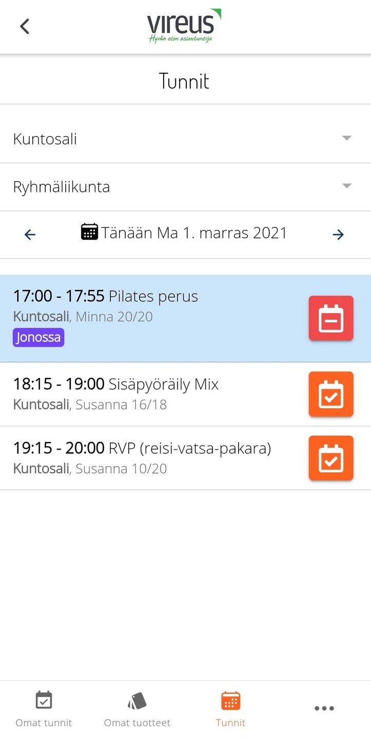 Pääset katsomaan tulevia tunteja ja tekemään niihin varauksia samaan tapaan, kuin selaimen varauskalenterin puolella. Varattu tunti on myös leimattavissa sovelluksen kautta.